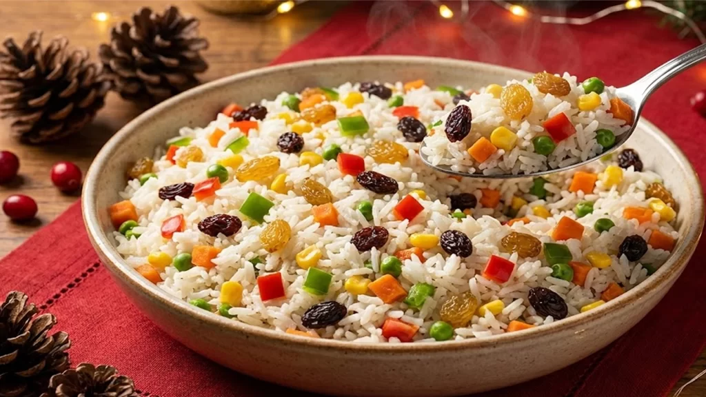 1. Aglomeração Festiva: O arroz branco é o nosso prato de todo dia. No Natal, precisamos transformá-lo em algo “especial”.